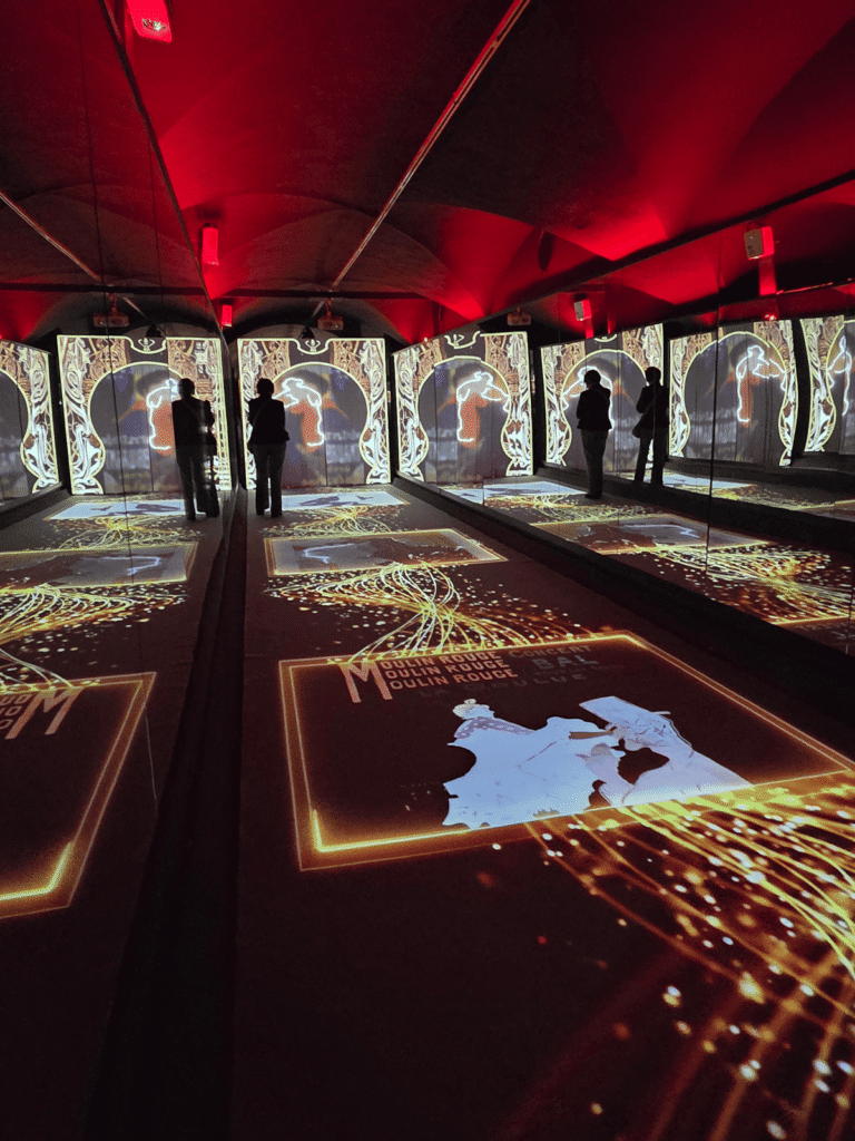 Mid-exhibit, patrons are invited to sit at a simulated Montmartre café wallpapered in vintage life-size photographs, with miniature bistro tables and chairs, in front of a well-lit stage where videos of contemporaneous can-can dancers fill the screen. Alas, there is no table service, but if there were, surely the Tremblement de Terre (the “Earthquake”) would be on the drink list, Toulouse-Lautrec’s signature cocktail of equal parts absinthe and cognac.
