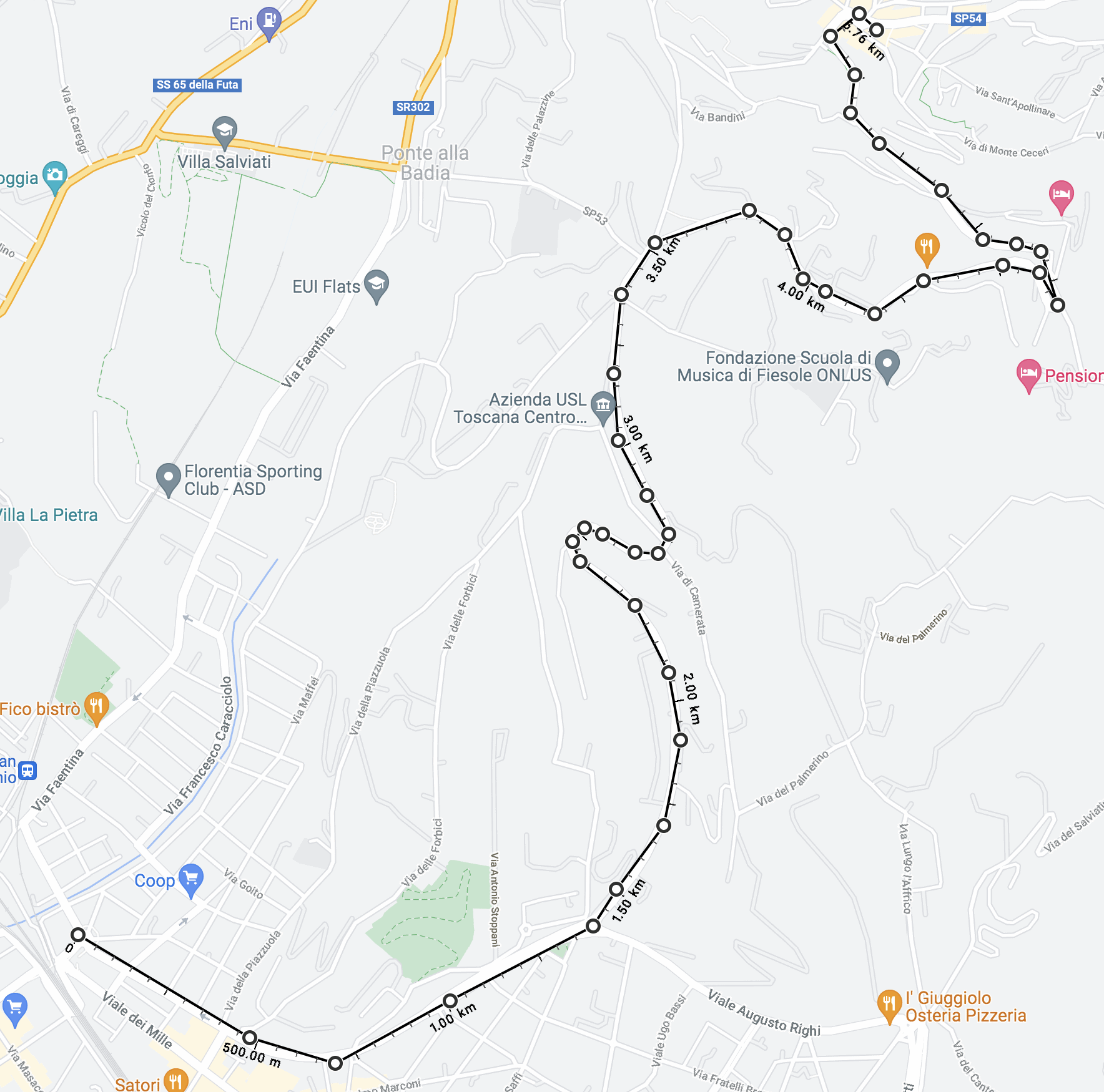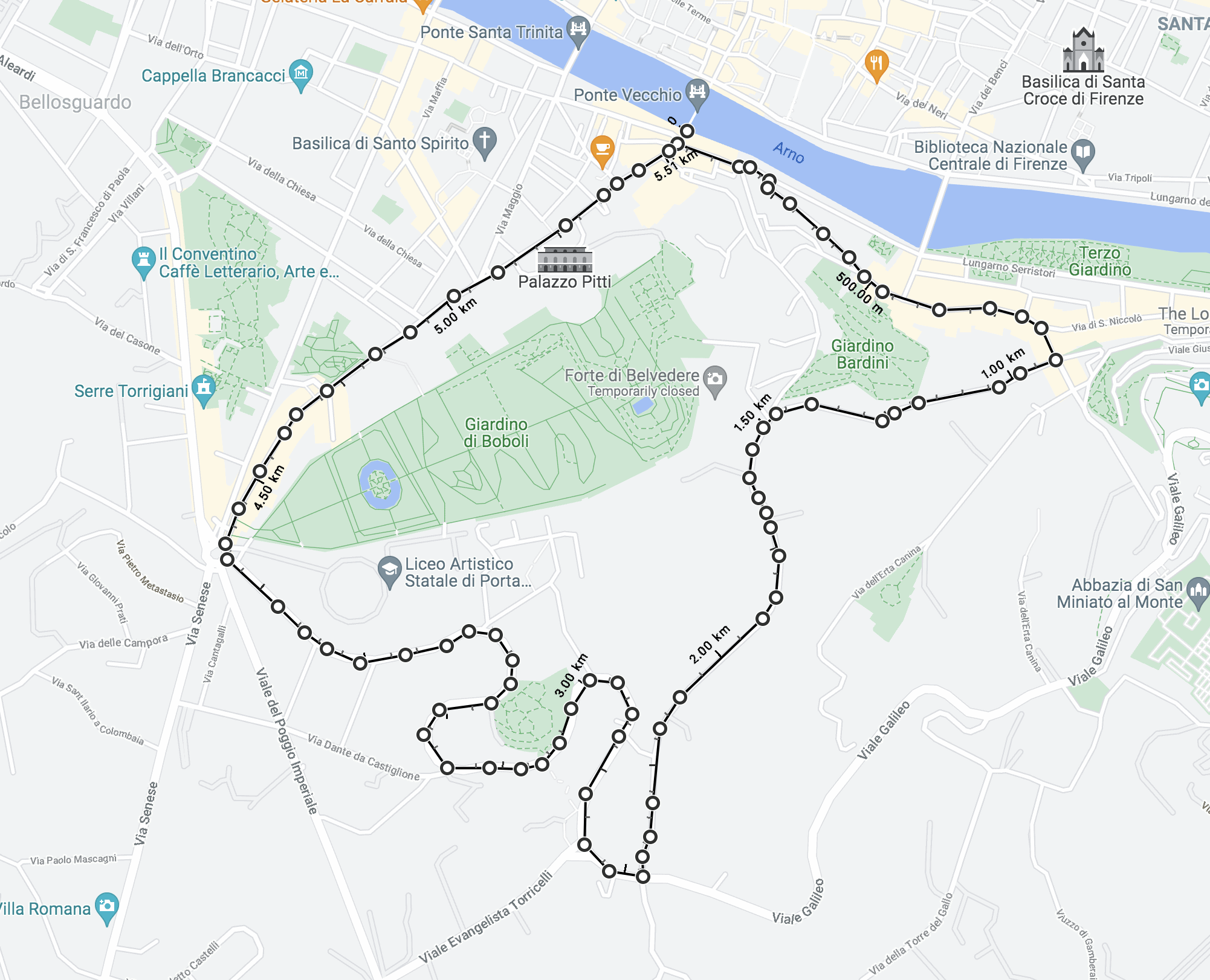 Length? 5.5km. Starting on the south side of the Ponte Vecchio, make your way east and down the – usually emptier than the main road – alley, Via de’ Bardi. Continue until you get to Porta San Miniato, and right up that long, steep hill, Via di Belvedere. Once you conquer this mountain of a hill you have a nice flat bit of running to do, with an occasional view of the city and the hills. After about 1.5km, turn right again onto Viale Machiavelli and enjoy the beautiful scenery below. Your run will take you meandering through Giardino Bobolino and then over Giardino di Boboli, and it is a view you cannot get tired of. Eventually, you will reach Porto Romana, pass through it and continue on to Via Romana, which will take you back to your starting point, or thereabouts. Despite being close to the centre, this run is usually free of people, and a lovely trip if you can handle the hills.